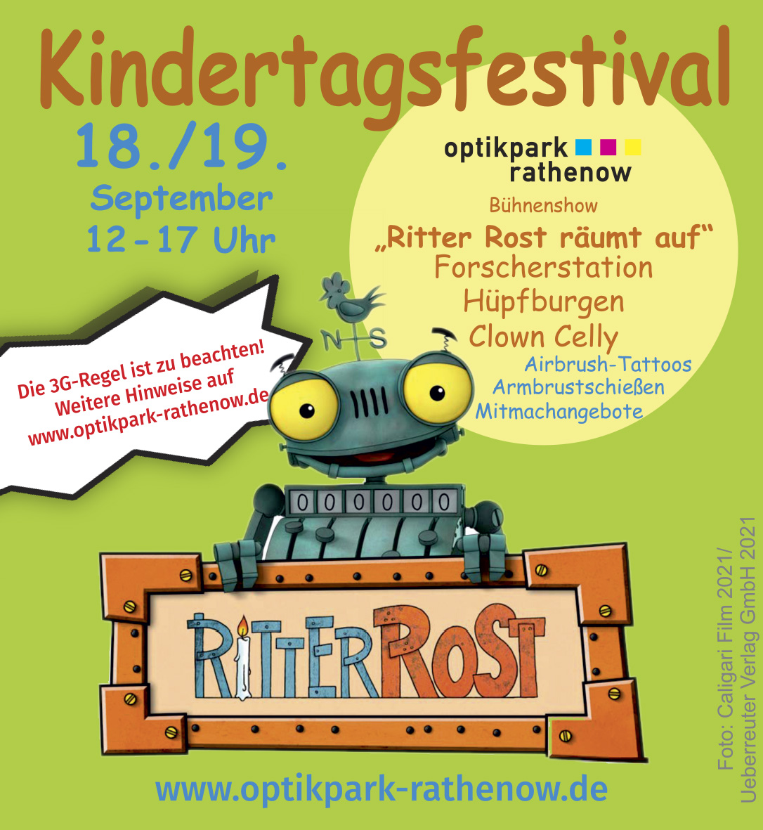 Das größte Highlight an den beiden Tagen wird unumstritten „Ritter Rost“ sein. Den wohl witzigsten, stärksten und klügsten Ritter, bekannt aus Büchern, Film und Fernsehen, ist gleich mehrmals an beiden Tagen auf der Bühne zu erleben. Der tollpatschige Ritter Rost lädt jeweils um 13.30 Uhr, 14.30 Uhr 15.30 Uhr und 16.30 Uhr zu seiner Bühnenshow ein. Alle kleinen Fans können mitmachen und fröhliche Abenteuer erleben. Seine berühmten Lieder dürfen natürlich nicht fehlen und so kann jedes Kind kräftig mitsingen. Zwischen den Shows kann man sicher ein Foto mit seinem Idol erhaschen und an der Aktionsstation selbst wahrhaft Ritterliches basteln.Wer noch mehr lachen mag, der besucht dann auch Clown Celly, der mit allerhand Clownerie Stimmung bringt.